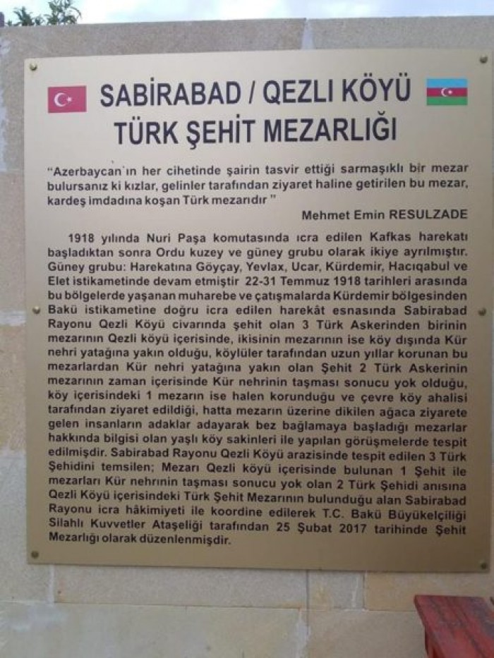 1918-ci ilin mart-avqust tarixləri arasında yaratdığı şərq orduları qrupuna daxil olan Hərbi birliklər, Hərbi nazir Ənvər Paşanın əmri ilə yaradılıb və tamamilə müsəlmanlardan ibarət idi. Qafqaz İslam Ordusu Nuru Paşanın komandanlığı altında 12-14 min Osmanlı əsgərindən ibarət olaraq yola çıxdı. Bu orduya Azərbaycan türklərindən və Dağıstan müsəlmanlarından ibarət könüllülərin qatılması ilə təqribən 20 min olmuşdur. Bolşevik-daşnak qüvvələrinin hücumlarının genişlənməsinə yol verməmək üçün 5-ci Qafqaz Diviziyasının 13-cü piyada alayı Kürdəmir ətrafına yönəldilər. Qafqaz hərəkatı başlanandan sonra Nuru Paşa ordunu quzey və güney qruplarına böldü. Güney qrupu öz istiqamətini Göyçay, Yevlax, Ucar, Kürdəmir, Hacıqabul və Ələt istiqamətində davam etmişdir. 22-31 iyul 1918-ci il tarixləri arasında bu ərazilərdə yaşanan müharibə və döyüşlərdə Kürdəmir bölgəsindən Bakı istiqamətinə doğru icra edilən hərəkat əsasında Sabirabad rayon Qəzli kəndi ətrafında Şəhid olan 3 türk əsgərinin cəsədlərindən ikisi yerli sakinlərin yardımı ilə Qəzli kəndinin içərisindən keçən Kür çayının sol sahilində dəfn edildi. Digər yaralı əsgəri kəndə gətirdilər. Lakin Rus-Erməni Bolşevik qüvvələri bundan xəbər tuturlar. Kəndə girərək yaralı türk əsgərini silah gücünə sakinlərin əlindən alaraq özləri ilə aparırlar. Türk əsgərin silahı çox qızdığından yararsız idi. Bolşevik Rus-Erməni qüvvələri yaralı əsgəri amansızcasına qətlə yetirdilər. Cəsədi yerli sakinlərə vermək istəmirdilər. Türk olan yerli əhali ağsaqqalları ilə və kənd sakinləri topladıqları qızılla türk əsgərinin cəsədini onlardan geri alaraq kəndin mərkəzində dəfn edirlər.