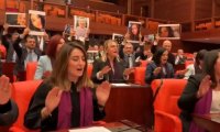 CHP-li bəzi millət vəkilləri də şiddət görən və öldürülən qadınların fotolarını əllərində tutub.